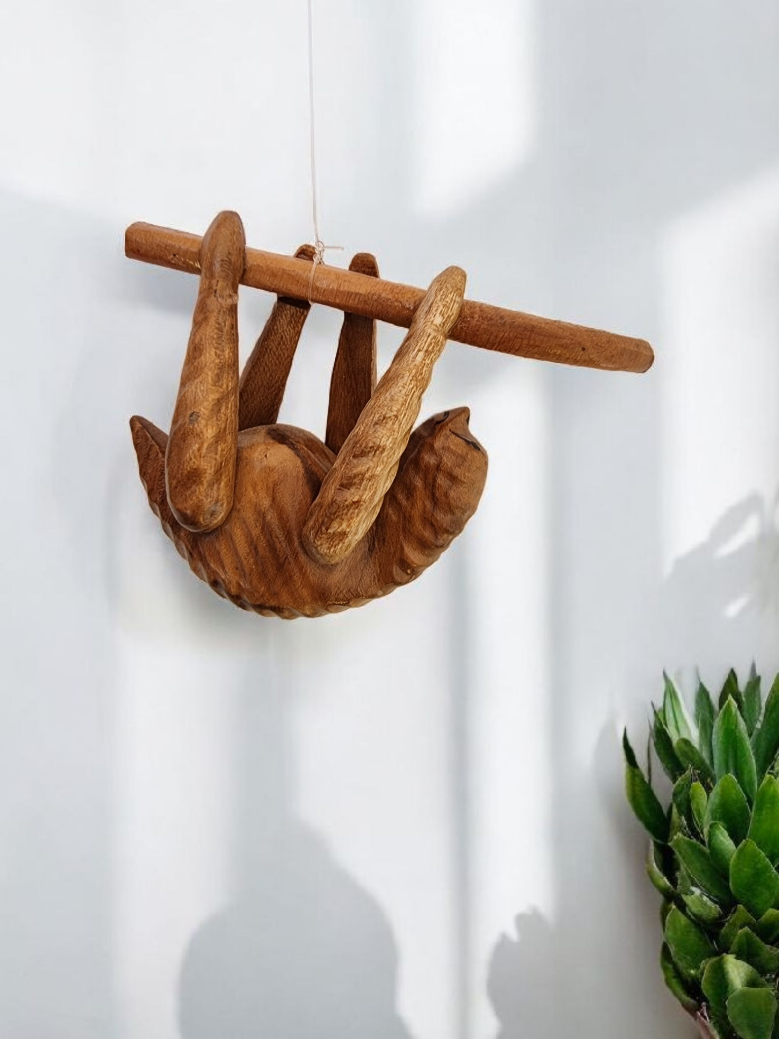 Kroppen er skåret ut av et lite trestykke fra Caesalpinia treet, med detaljer som fremhever dovendyrets avslappede holdning og vennlige uttrykk.
